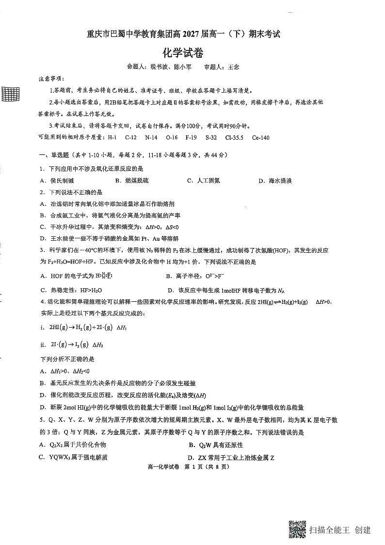 重庆市巴蜀中学教育集团高2027届高一(下)期末考试化学