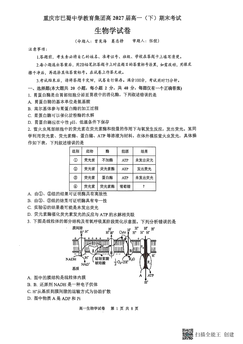 重庆市巴蜀中学教育集团高2027届高一(下)期末考试生物