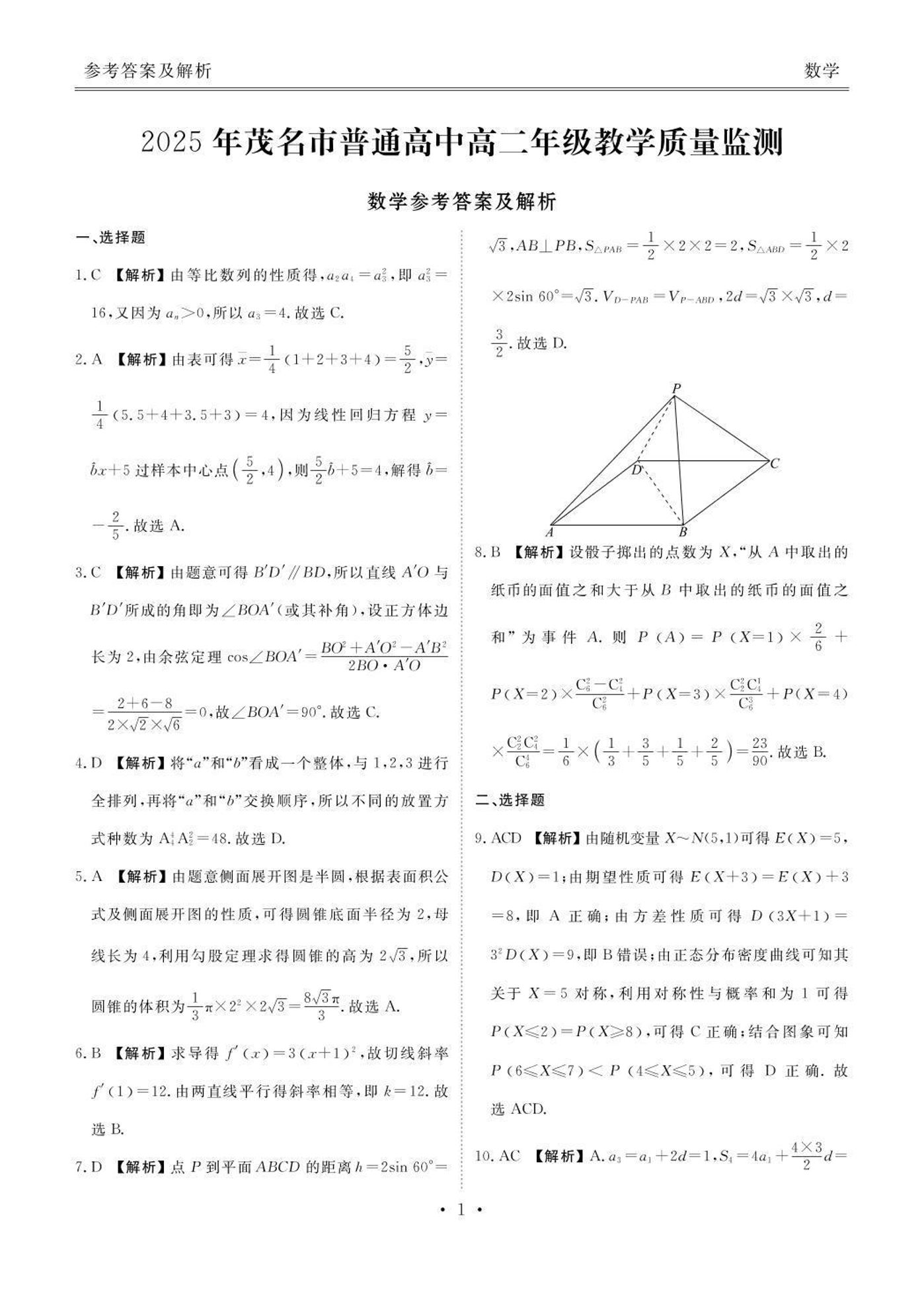 广东省茂名市2024-2025学年高二下学期期末教学质量监测数学答案