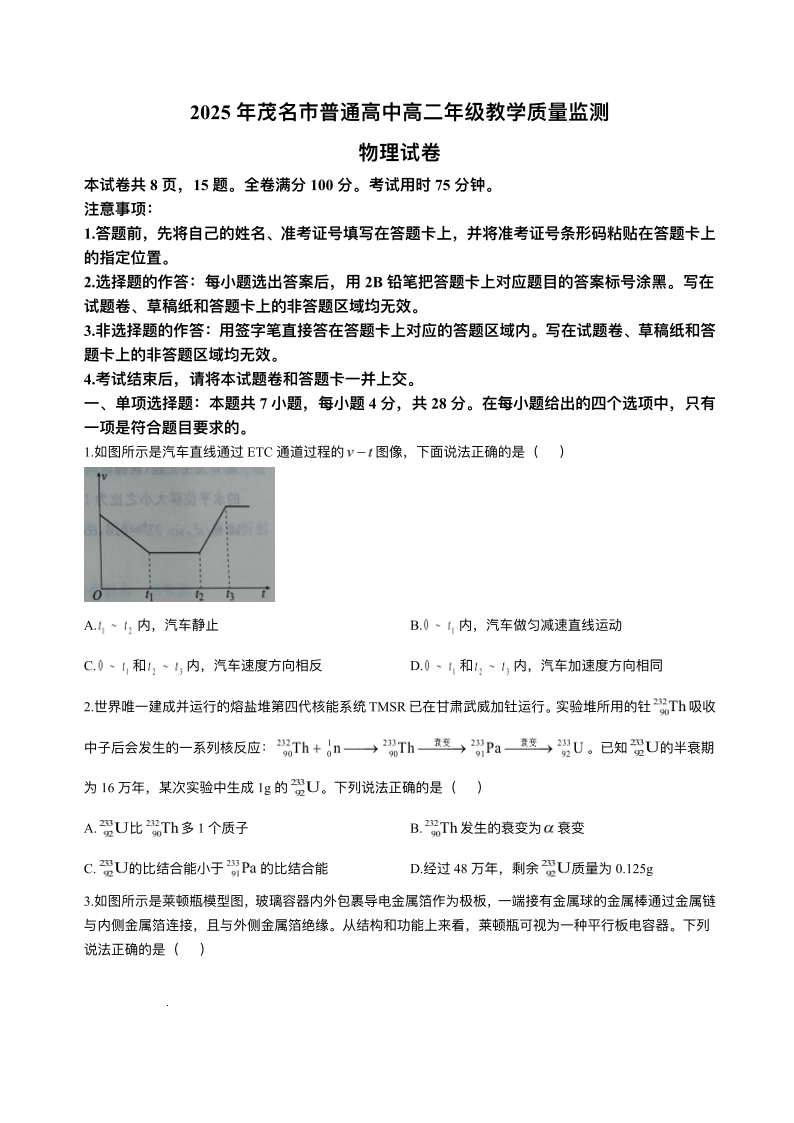 广东省茂名市2024-2025学年高二下学期期末教学质量监测物理+答案