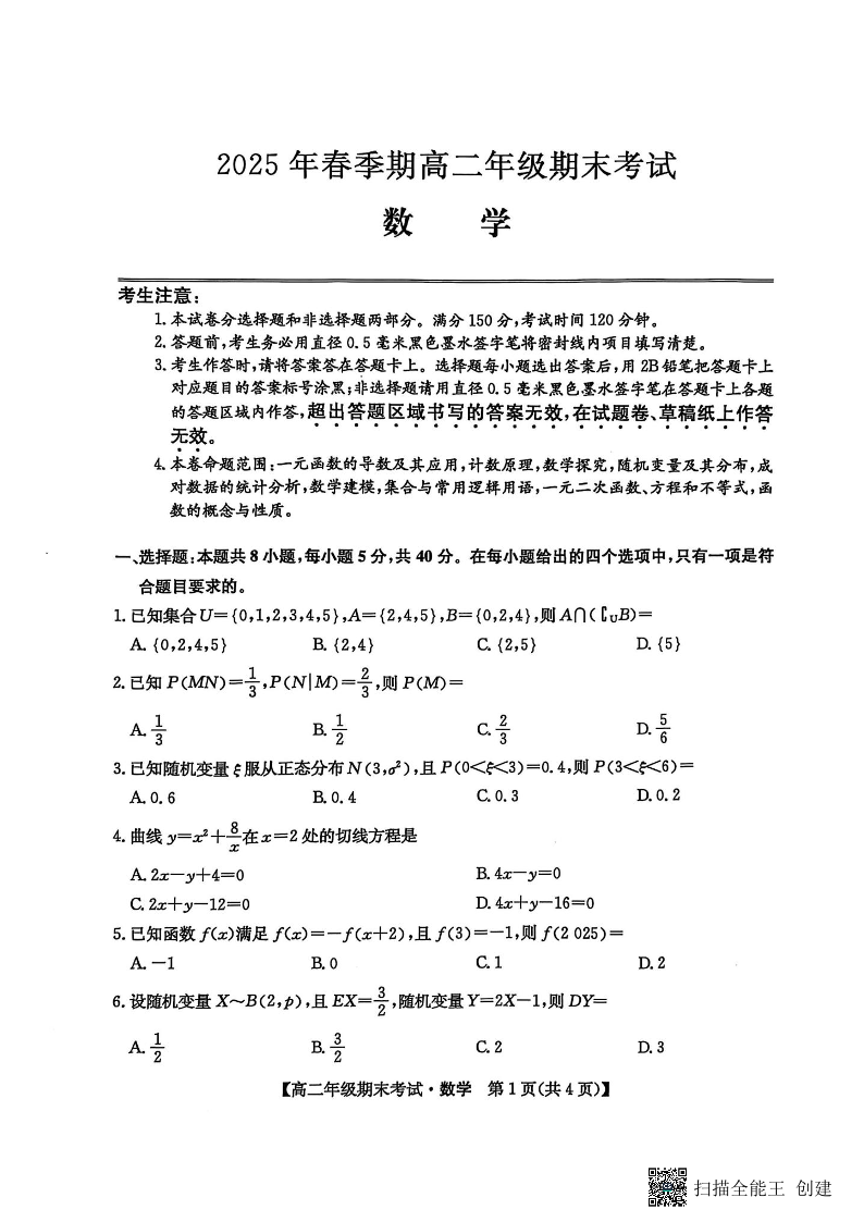 广西梧州市羽宸教育·新课程教研联盟暨2025年春季期高二年级7月期末考试数学(原卷版)