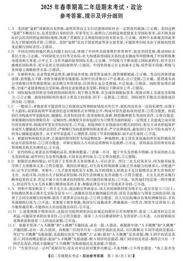 广西梧州市羽宸教育·新课程教研联盟暨2025年春季期高二年级7月期末考试政治答案