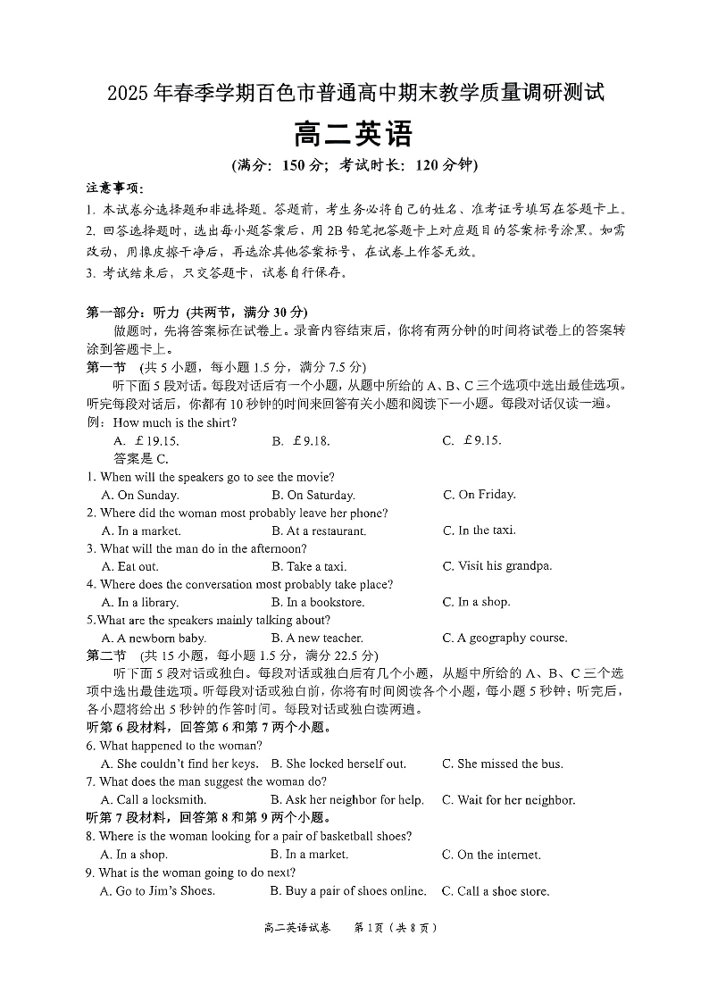 广西壮族自治区百色市2025年春季学期高二年级期末教学质量调研测试英语