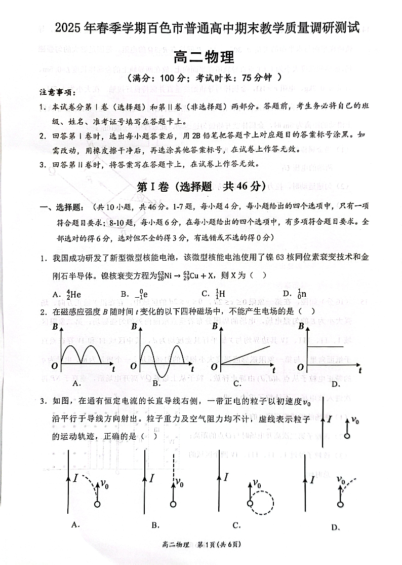 广西壮族自治区百色市2025年春季学期高二年级期末教学质量调研测试物理+答案
