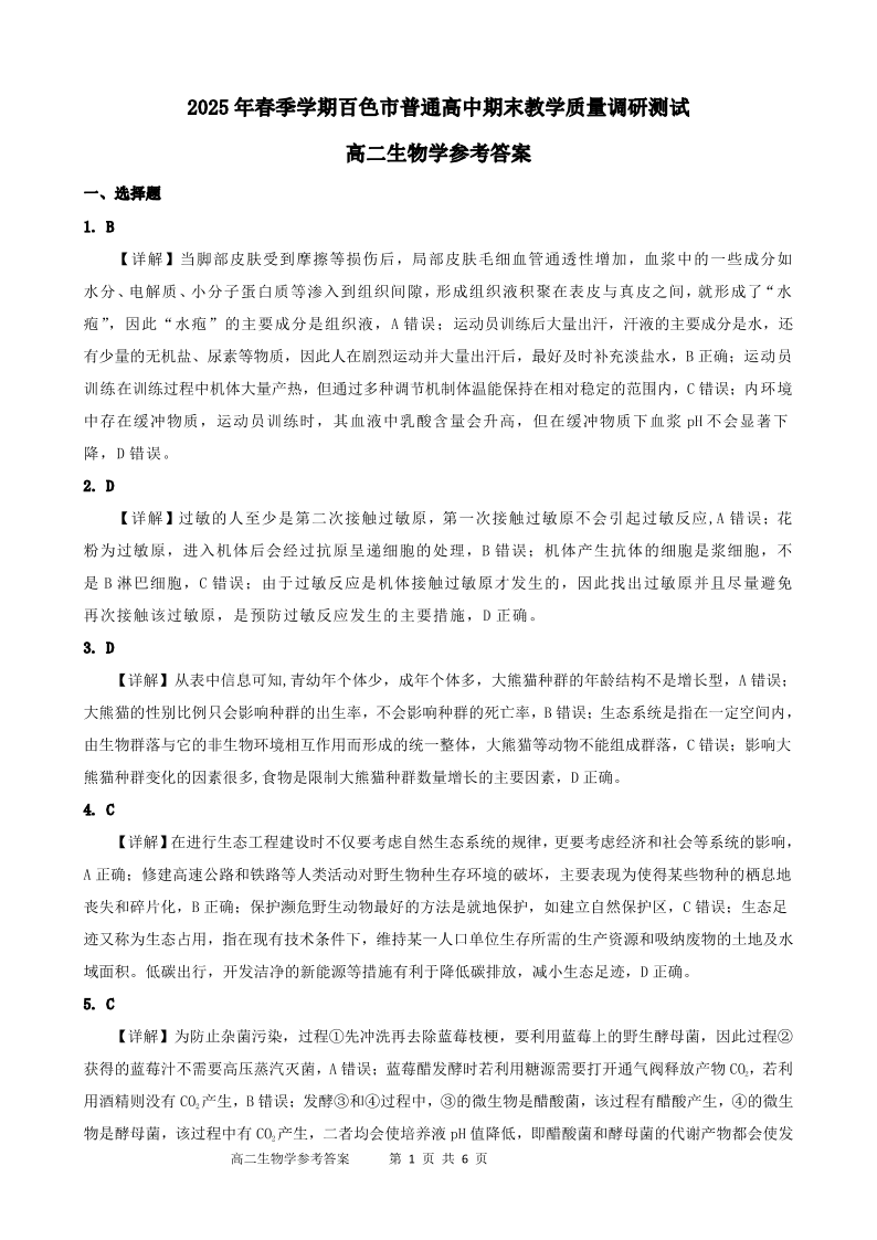 广西壮族自治区百色市2025年春季学期高二年级期末教学质量调研测试生物答案