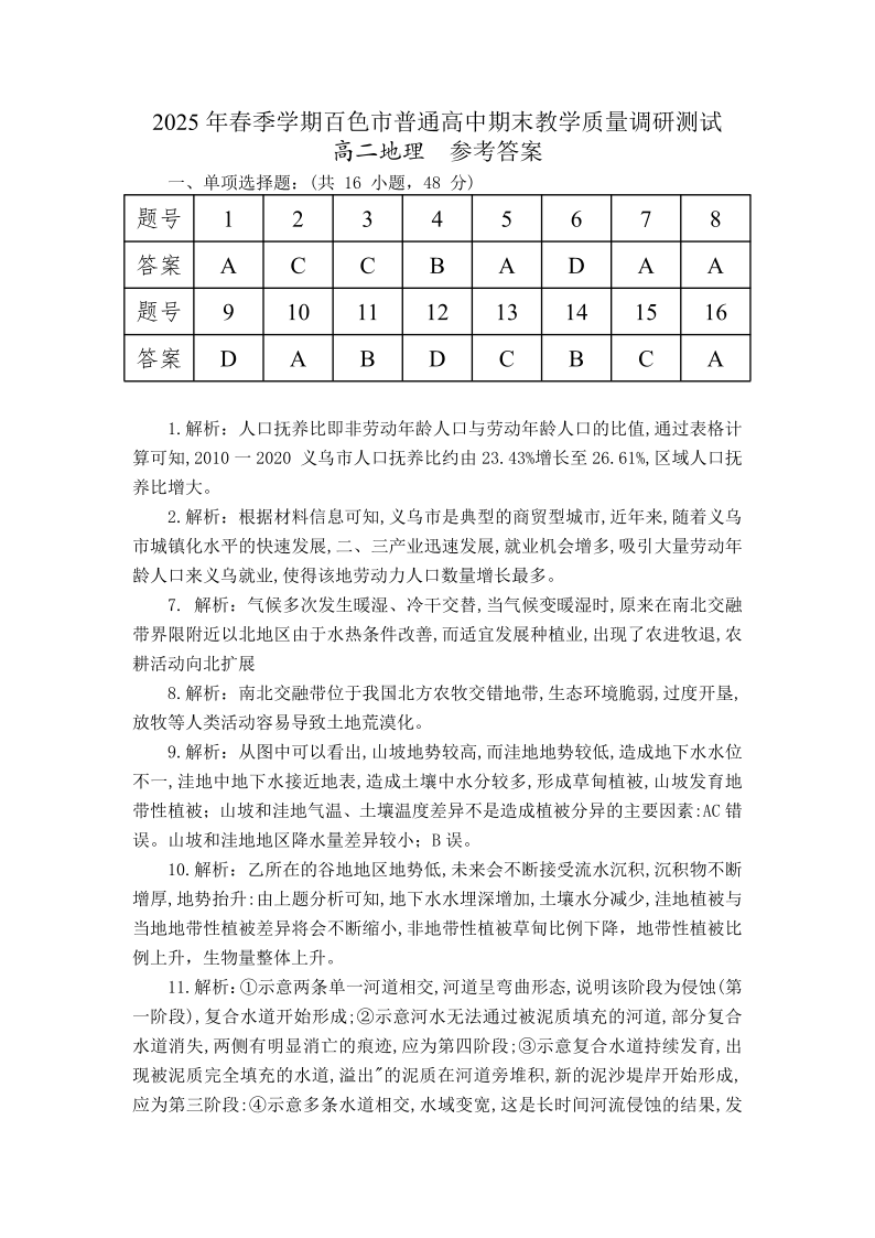广西壮族自治区百色市2025年春季学期高二年级期末教学质量调研测试地理答案