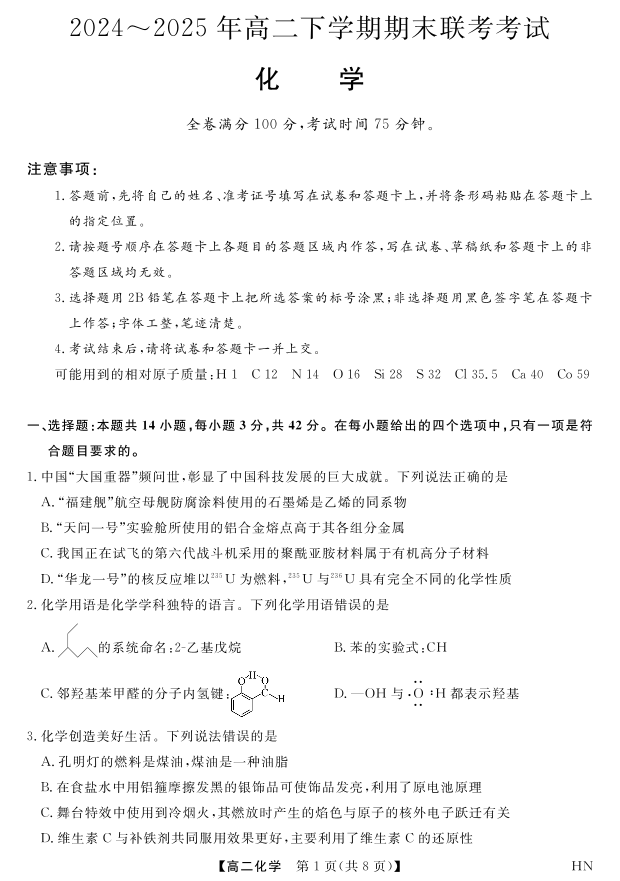 河南省金科·新未来2024-2025学年高二下学期期末联考化学
