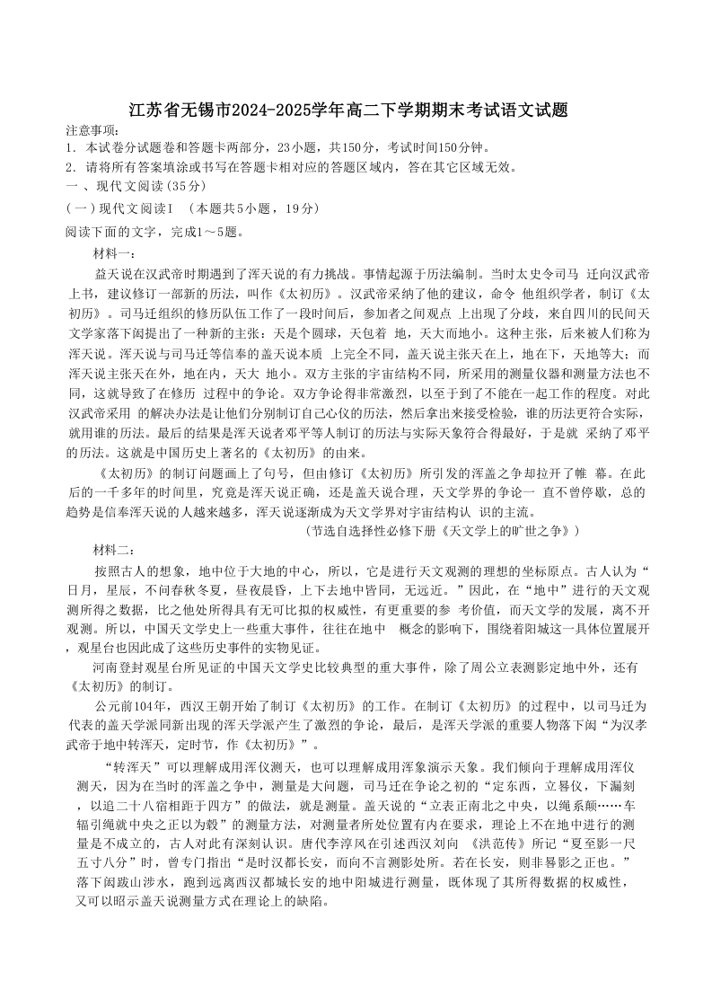 江苏省无锡市普通高中2024-2025学年高二下学期调研考试语文+答案