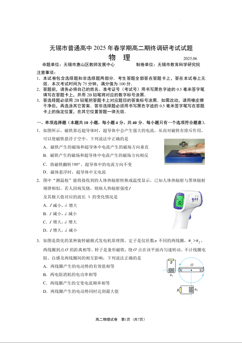 江苏省无锡市普通高中2024-2025学年高二下学期调研考试物理