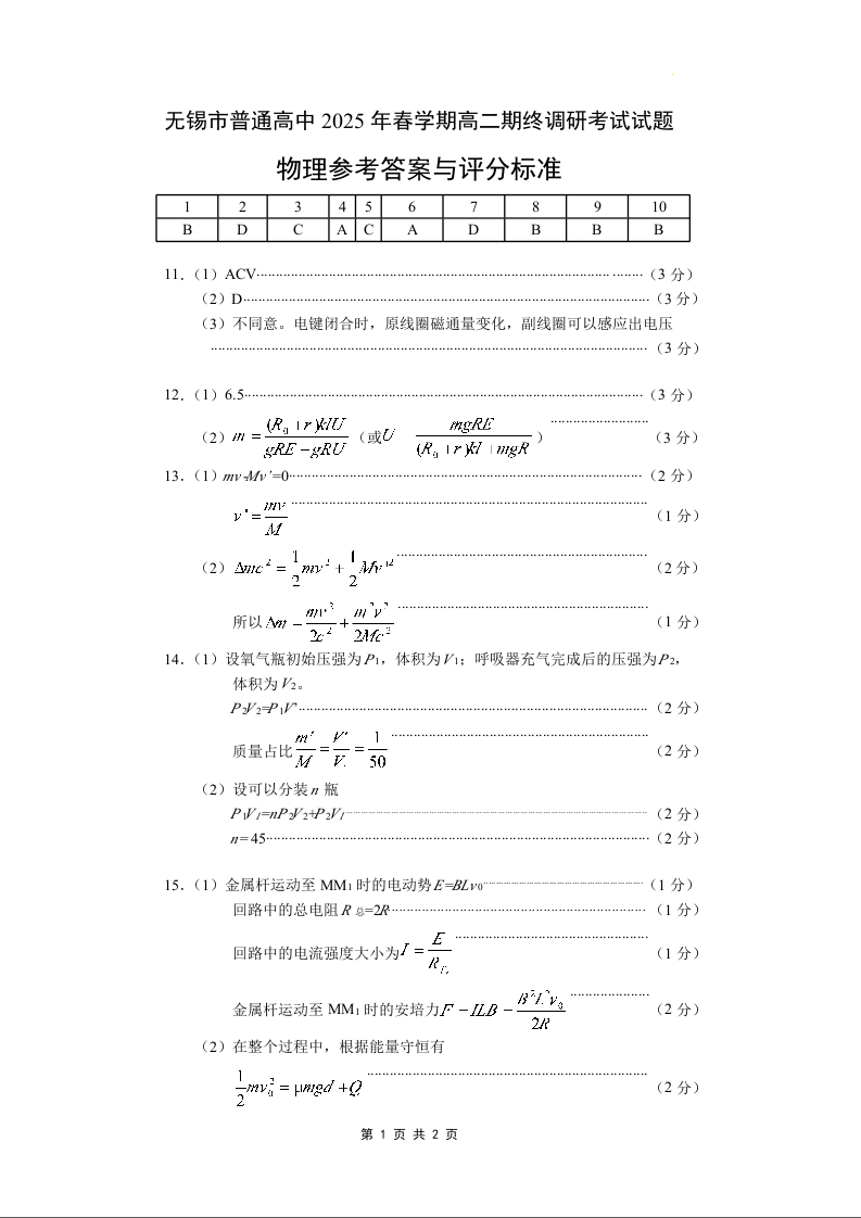江苏省无锡市普通高中2024-2025学年高二下学期调研考试物理答案