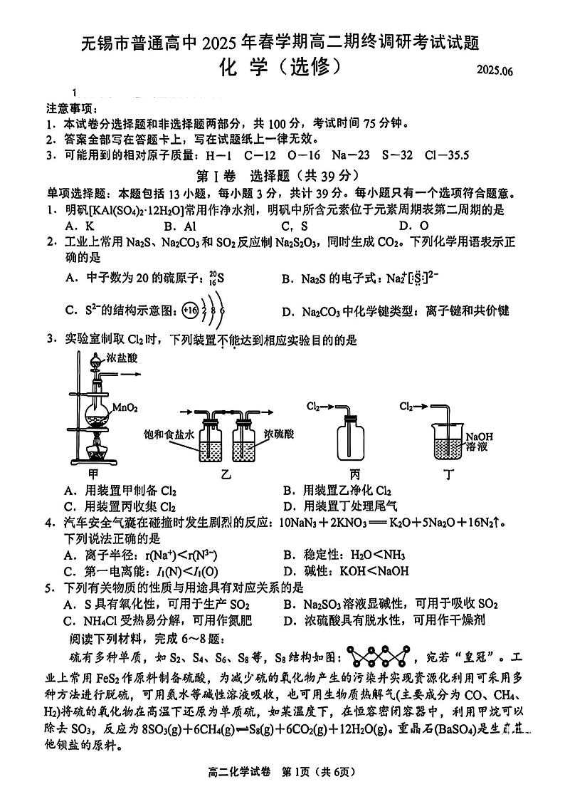 江苏省无锡市普通高中2024-2025学年高二下学期调研考试化学+答案