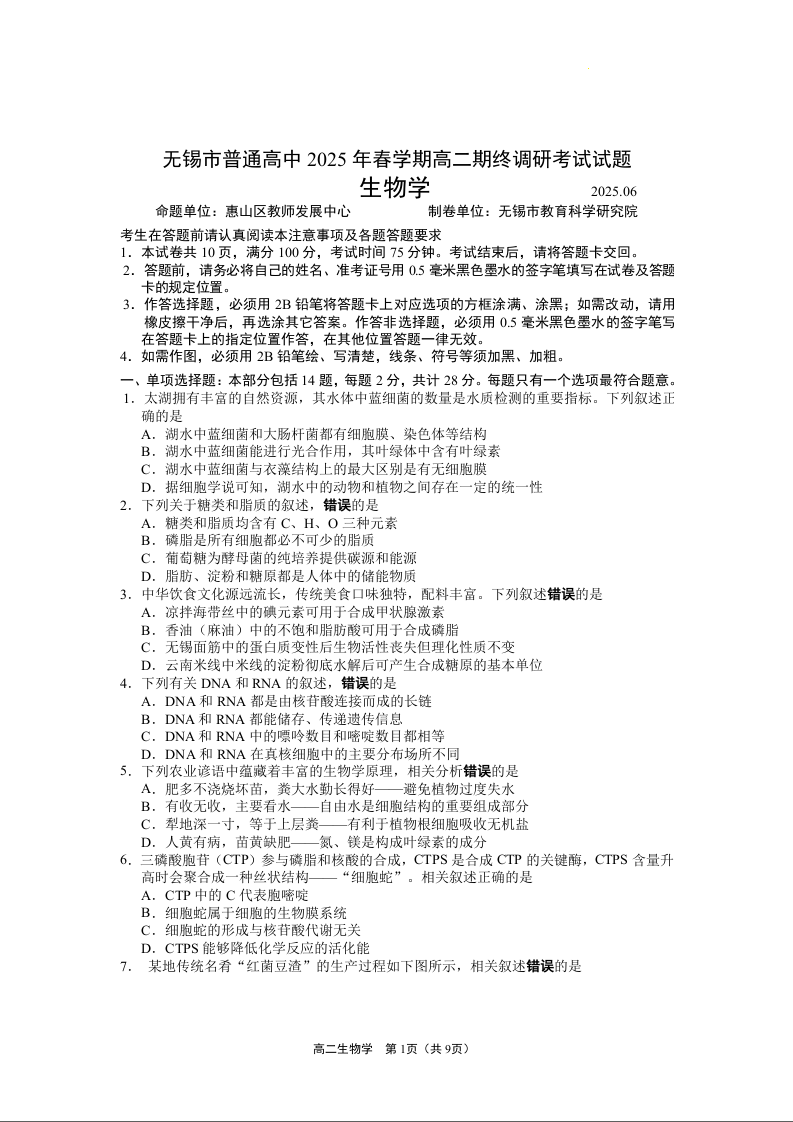 江苏省无锡市普通高中2024-2025学年高二下学期调研考试生物