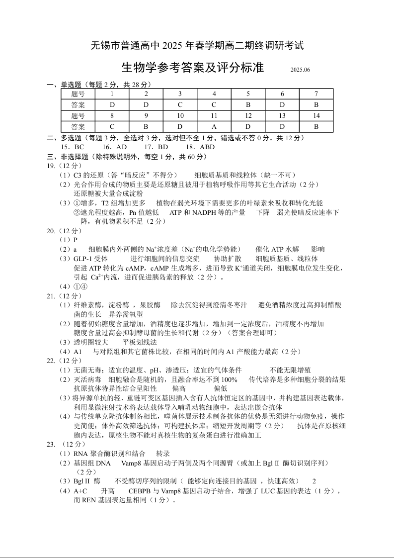 江苏省无锡市普通高中2024-2025学年高二下学期调研考试生物答案