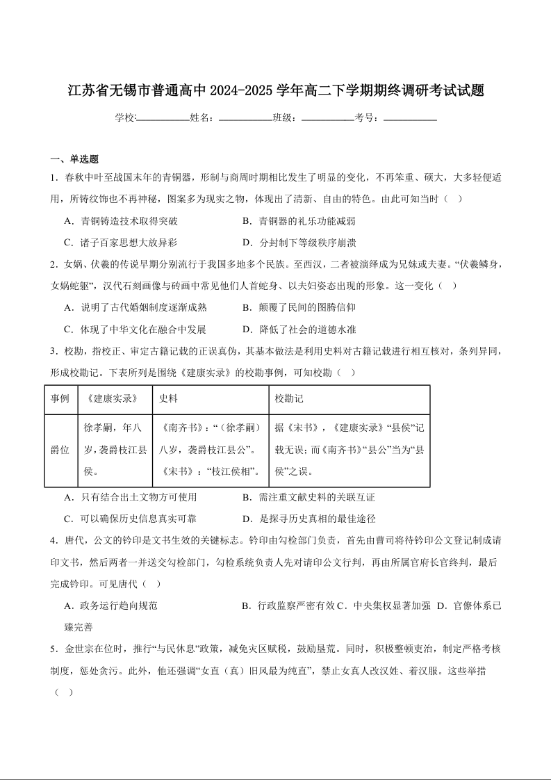 江苏省无锡市普通高中2024-2025学年高二下学期调研考试历史+答案