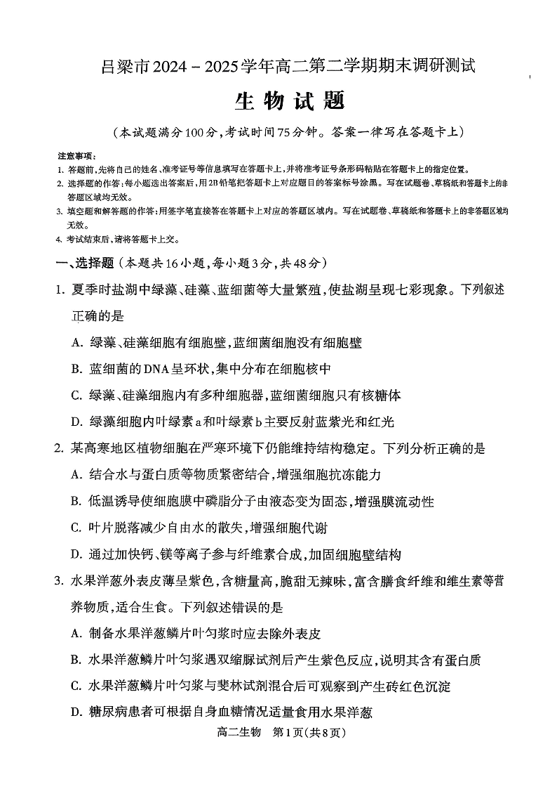 山西省吕梁市2024-2025学年高二下学期期末调研测试生物+答案
