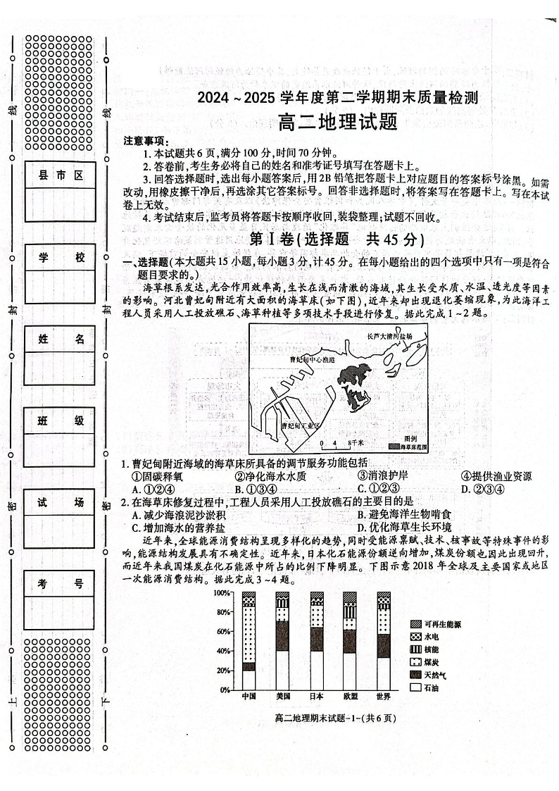 陕西省西安市新城区2024-2025学年高二下学期7月期末质量检测地理+答案
