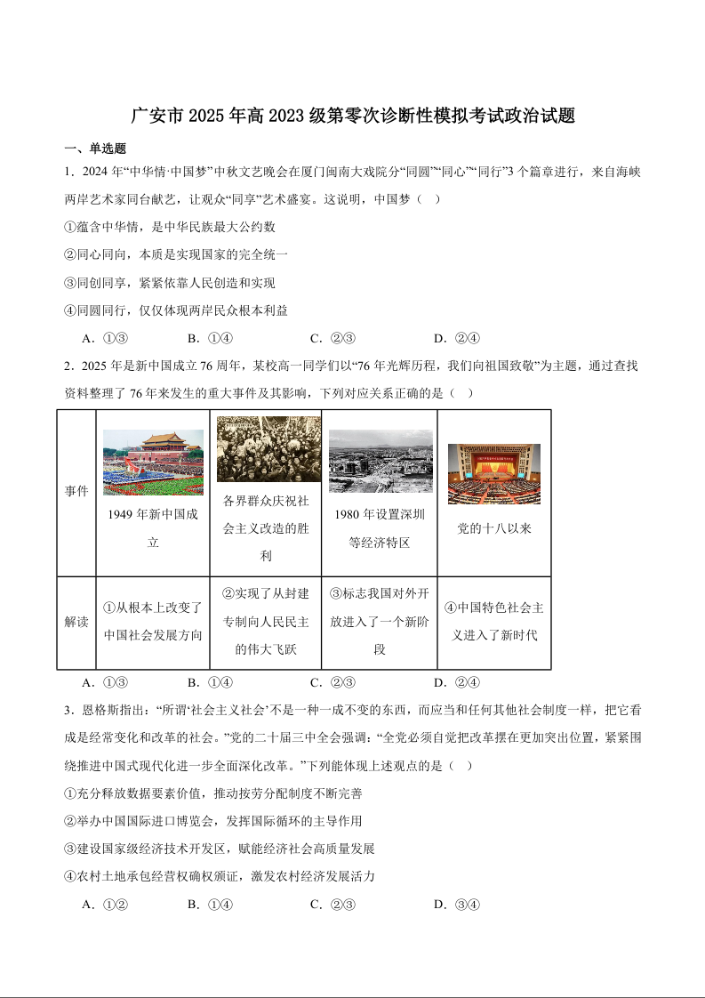 广安市2025年高2023级(2026届)第零次诊断性模拟考试(高三零诊)政治试题卷+答案