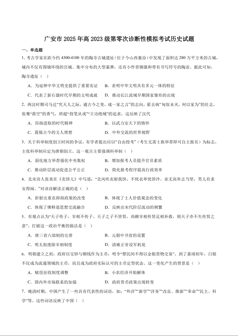 广安市2025年高2023级(2026届)第零次诊断性模拟考试(高三零诊)历史试题卷+答案