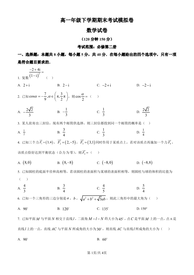 甘肃省2024-2025学年高一年级下学期期末考试数学