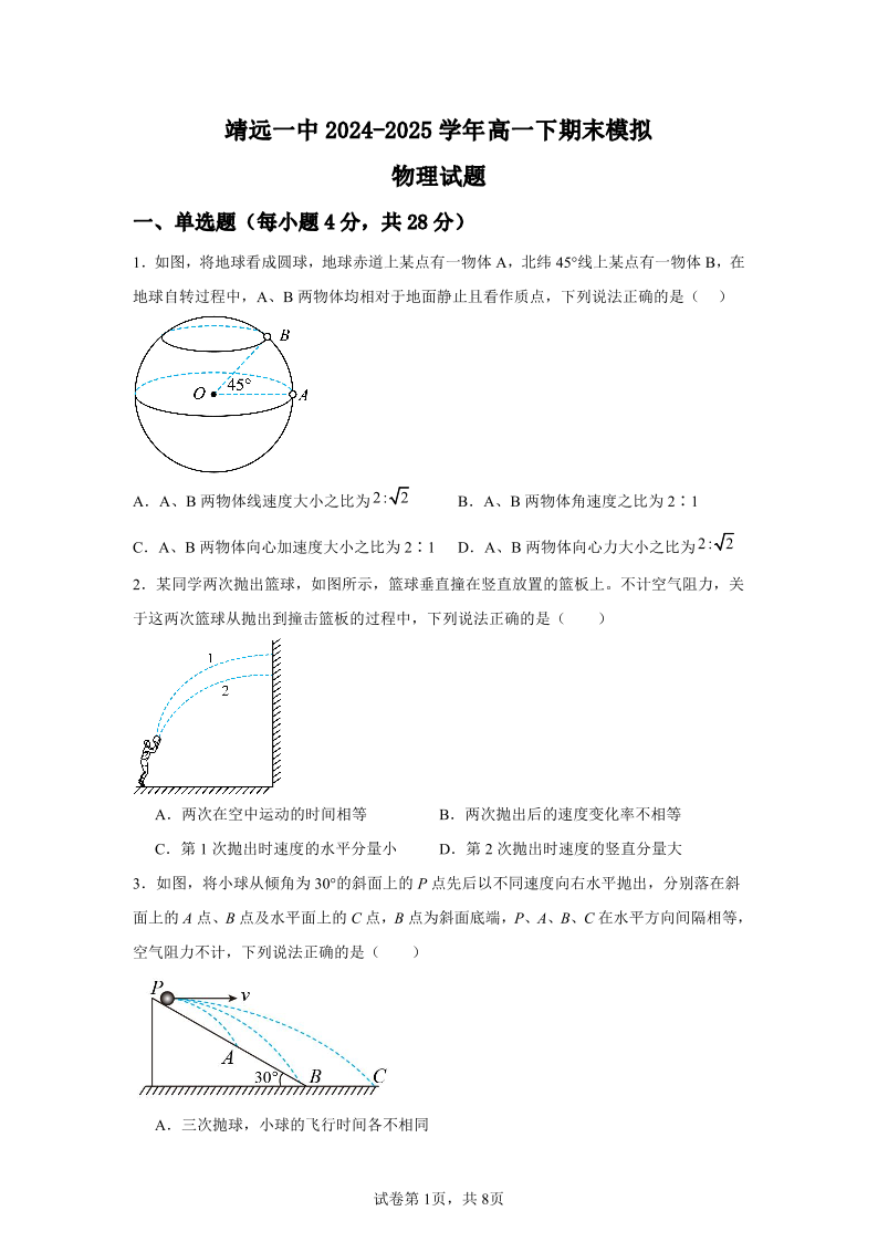 甘肃省2024-2025学年高一年级下学期期末考试物理+答案