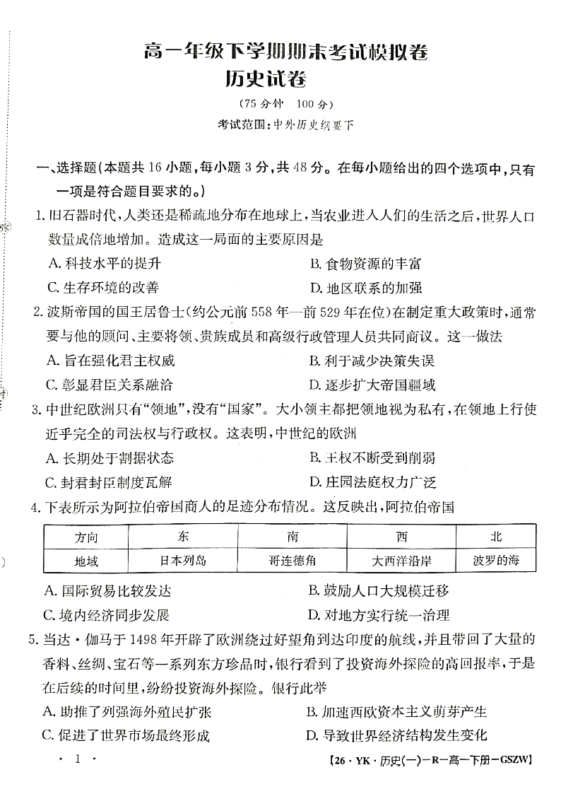 甘肃省2024-2025学年高一年级下学期期末考试历史