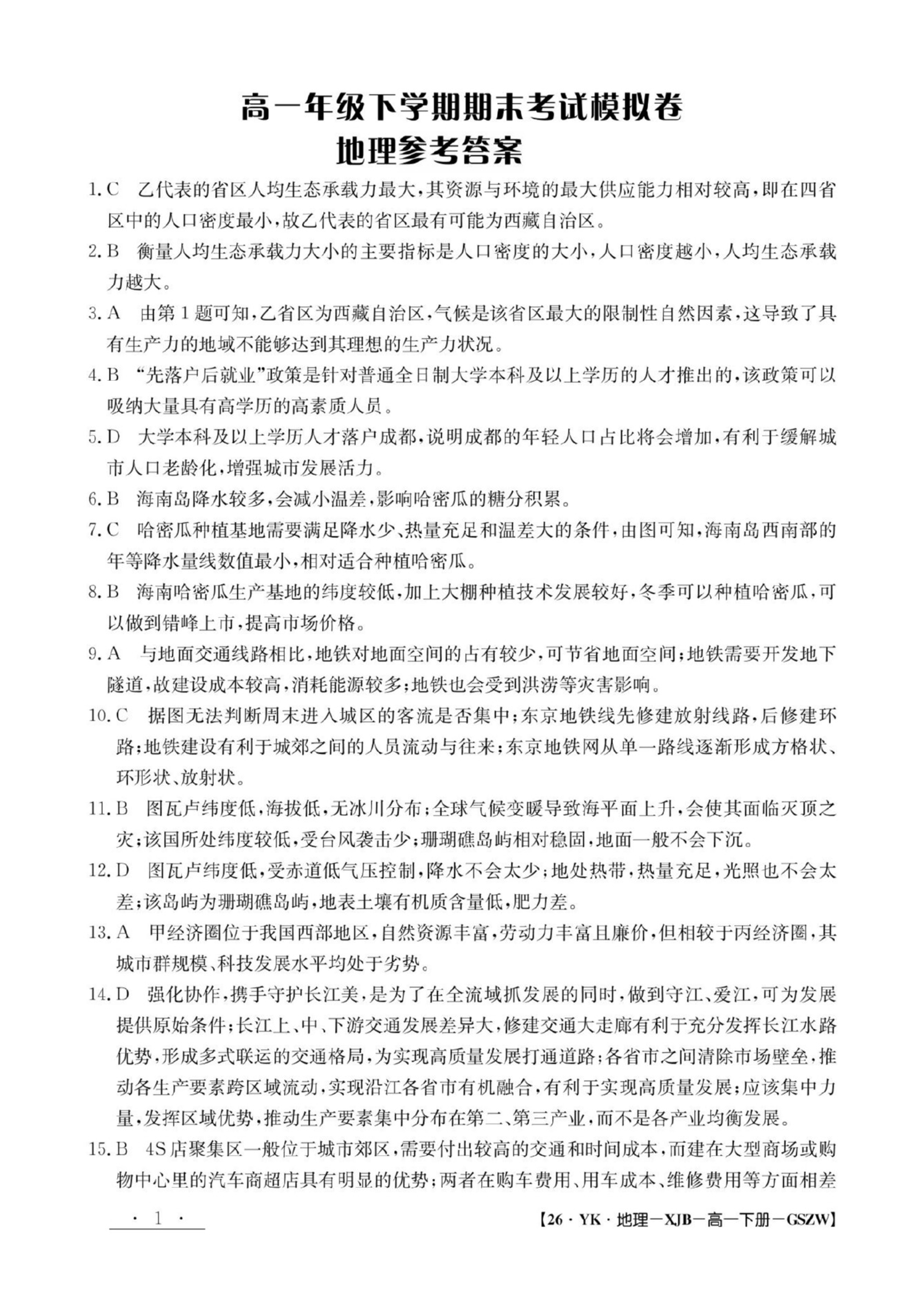 甘肃省2024-2025学年高一年级下学期期末考试地理答案