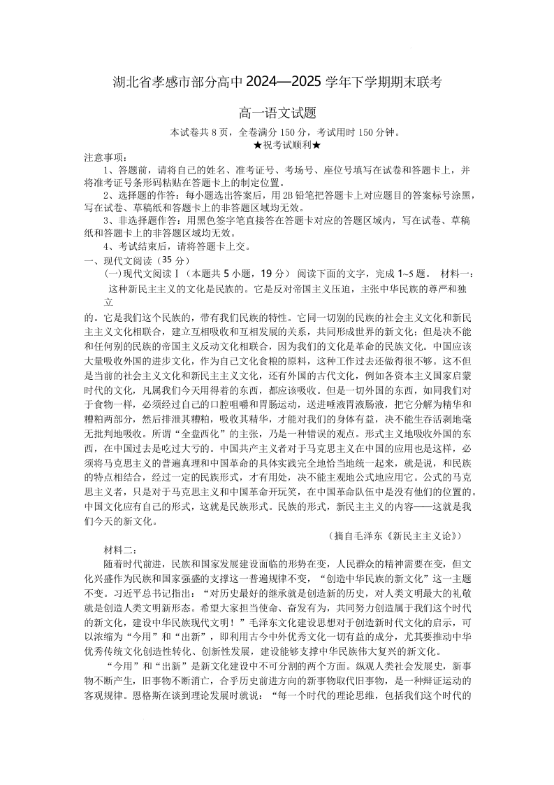 湖北省孝感市部分高中2024-2025学年高一下学期7月期末联考语文+答案