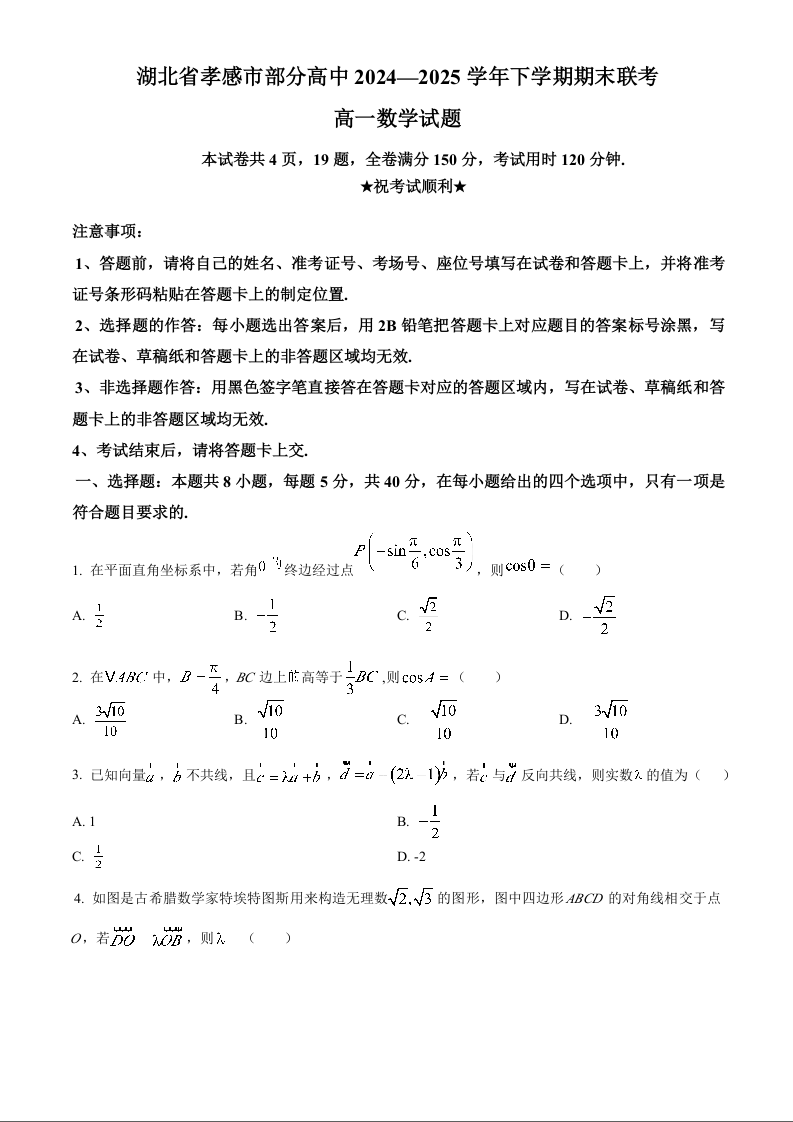 湖北省孝感市部分高中2024-2025学年高一下学期7月期末联考数学(原卷版)