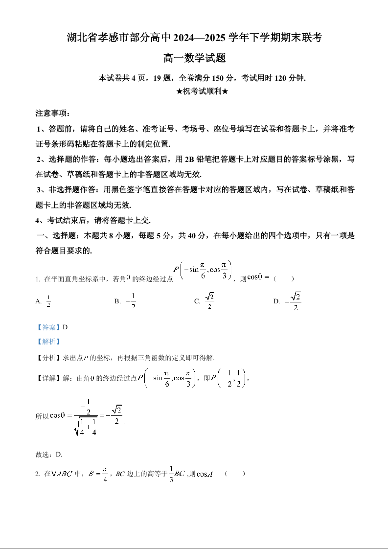 湖北省孝感市部分高中2024-2025学年高一下学期7月期末联考数学(解析版)