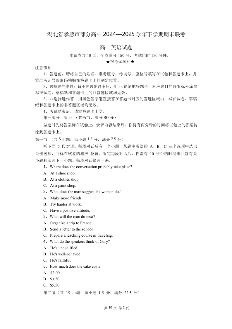 湖北省孝感市部分高中2024-2025学年高一下学期7月期末联考英语(原卷版)