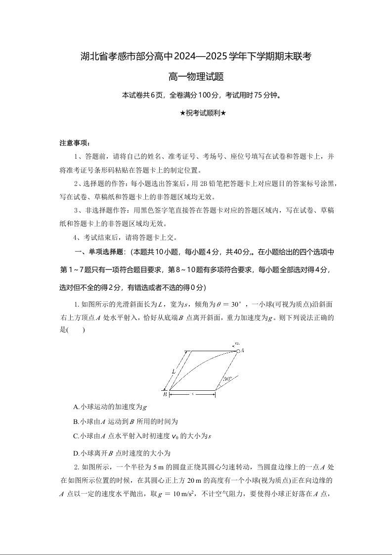 湖北省孝感市部分高中2024-2025学年高一下学期7月期末联考物理(原卷版)