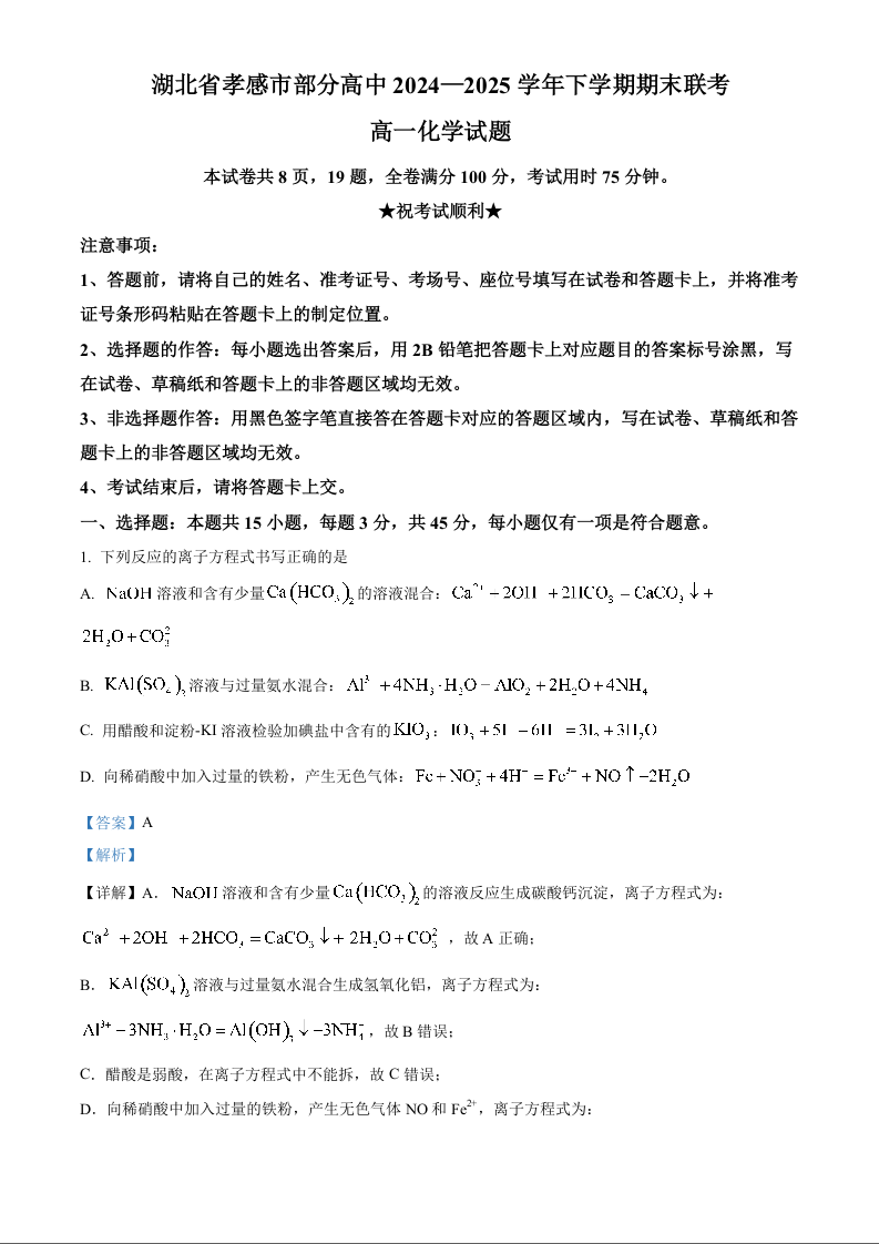 湖北省孝感市部分高中2024-2025学年高一下学期7月期末联考化学(解析版)