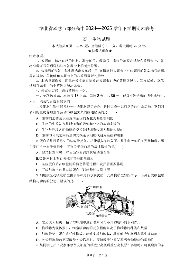 湖北省孝感市部分高中2024-2025学年高一下学期7月期末联考生物(原卷版)