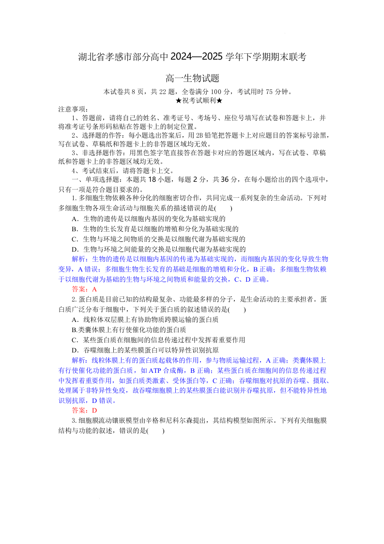 湖北省孝感市部分高中2024-2025学年高一下学期7月期末联考生物(解析版)