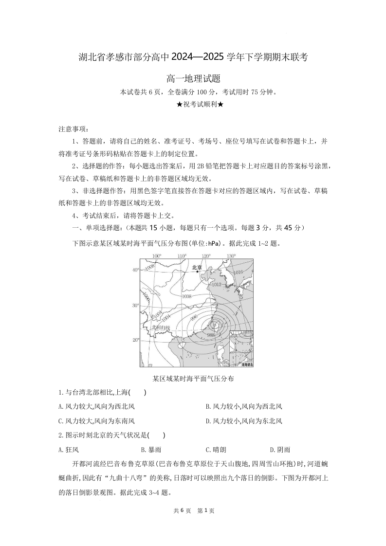 湖北省孝感市部分高中2024-2025学年高一下学期7月期末联考地理(原卷版)