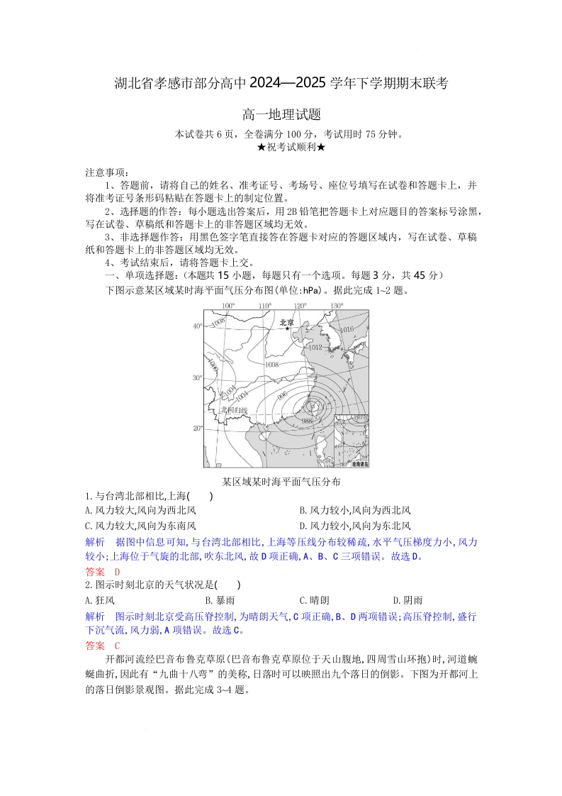 湖北省孝感市部分高中2024-2025学年高一下学期7月期末联考地理(解析板)
