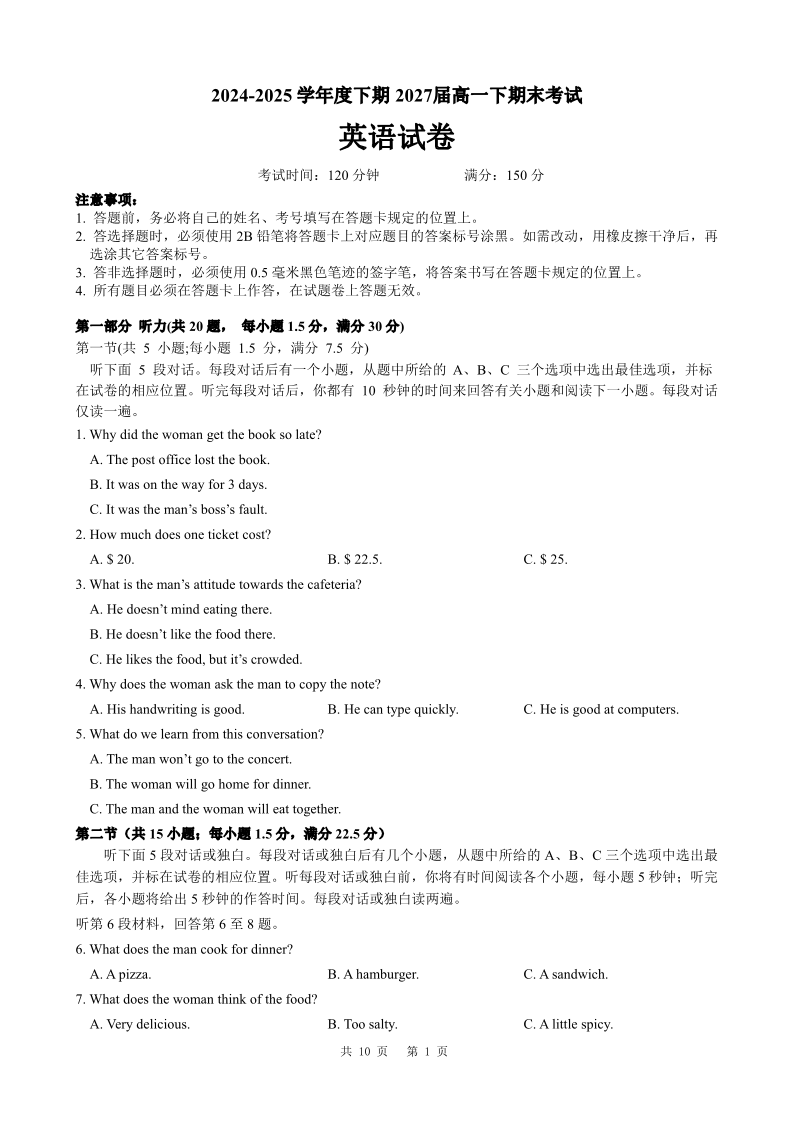 四川省成都市第七中学2024-2025学年度下期高一期末测试英语
