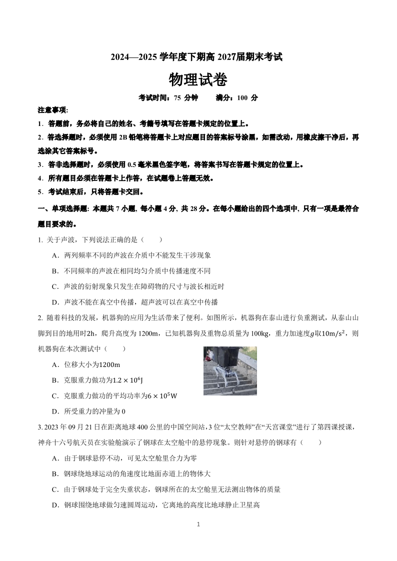 四川省成都市第七中学2024-2025学年度下期高一期末测试物理