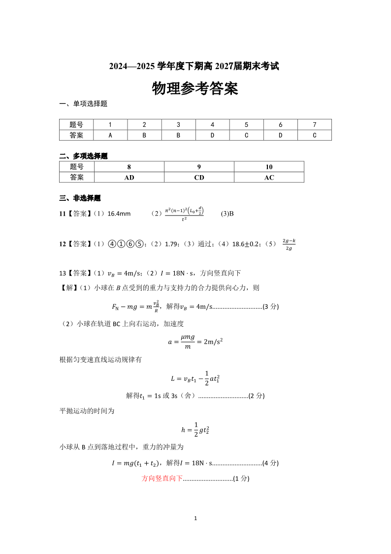 四川省成都市第七中学2024-2025学年度下期高一期末测试物理答案