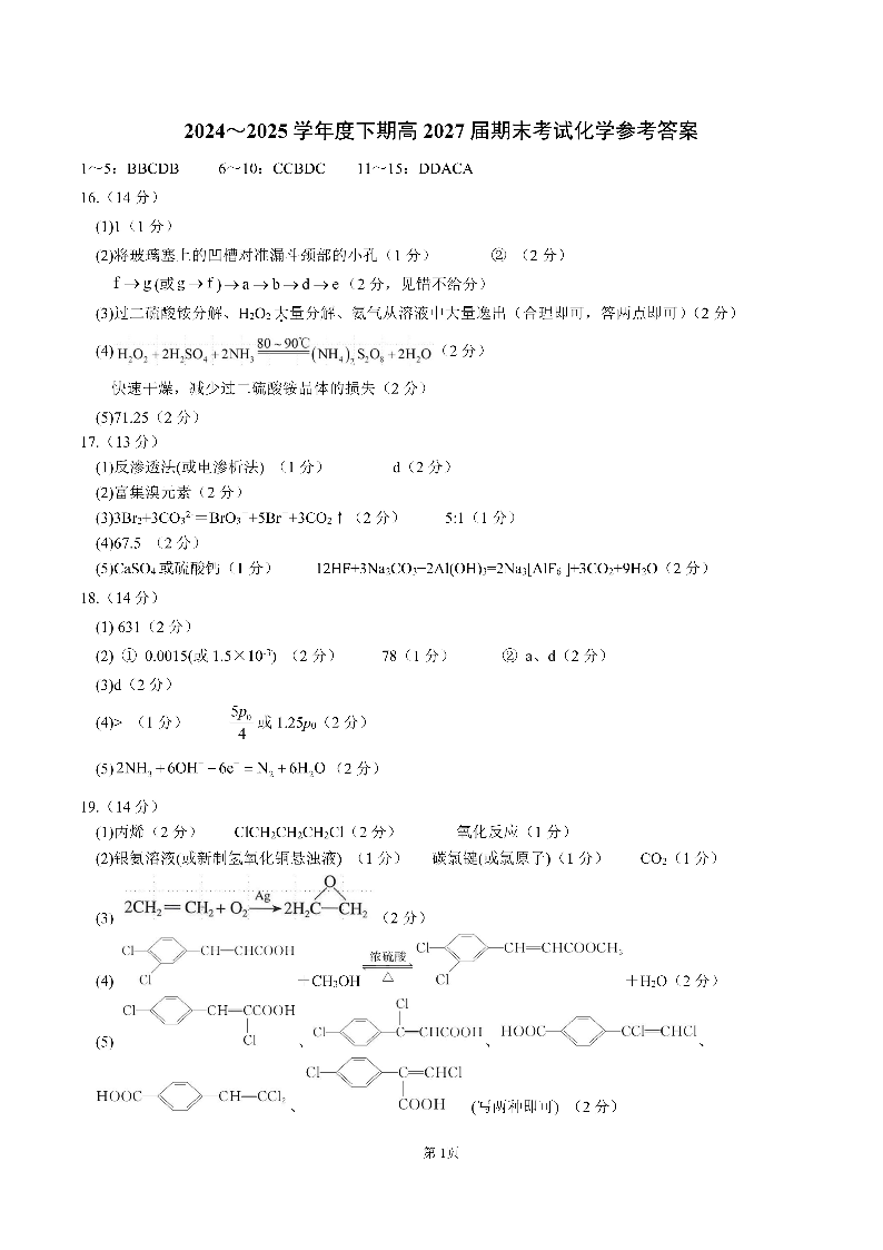 四川省成都市第七中学2024-2025学年度下期高一期末测试化学答案