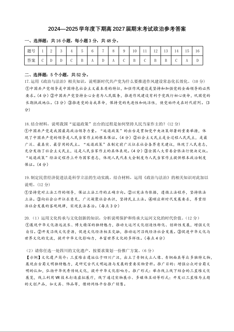四川省成都市第七中学2024-2025学年度下期高一期末测试政治答案