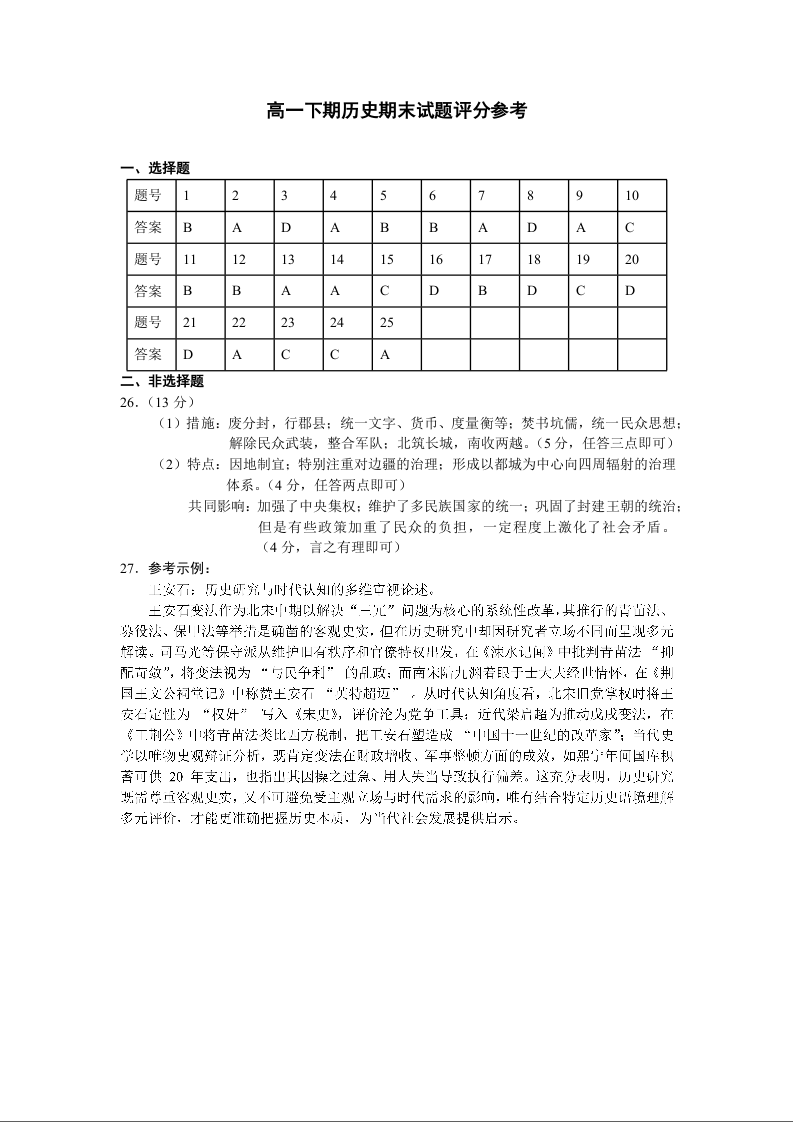 四川省成都市第七中学2024-2025学年度下期高一期末测试历史答案
