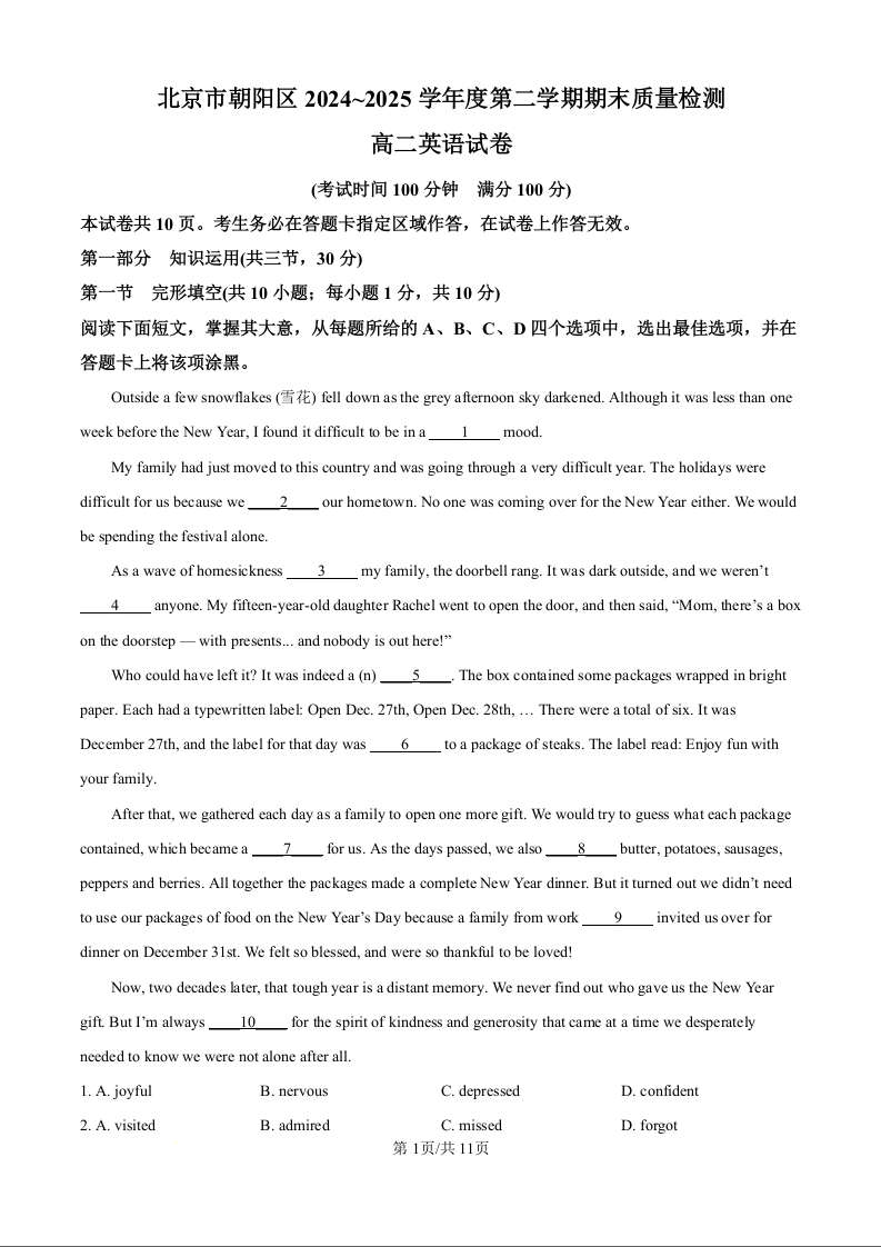 北京市朝阳区2024-2025学年高二下学期期末英语(原卷版)