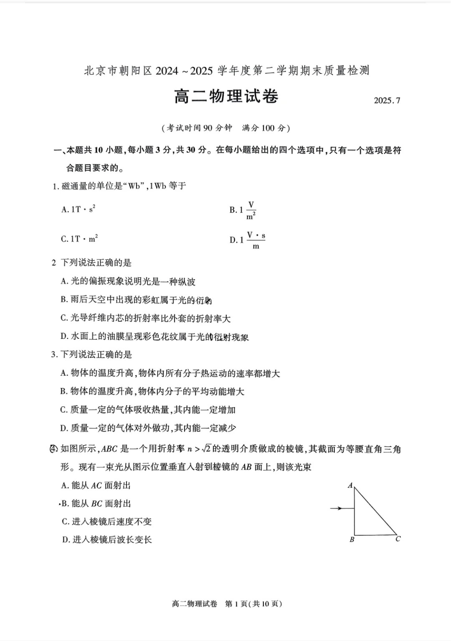 北京市朝阳区2024-2025学年高二下学期期末物理+答案