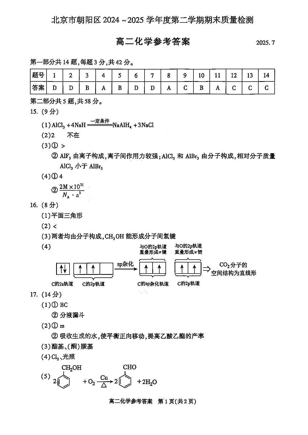 北京市朝阳区2024-2025学年高二下学期期末化学答案