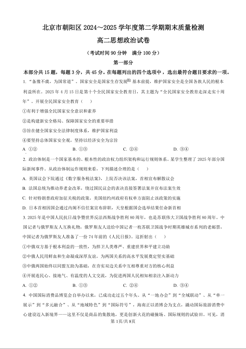 北京市朝阳区2024-2025学年高二下学期期末政治(原卷版)