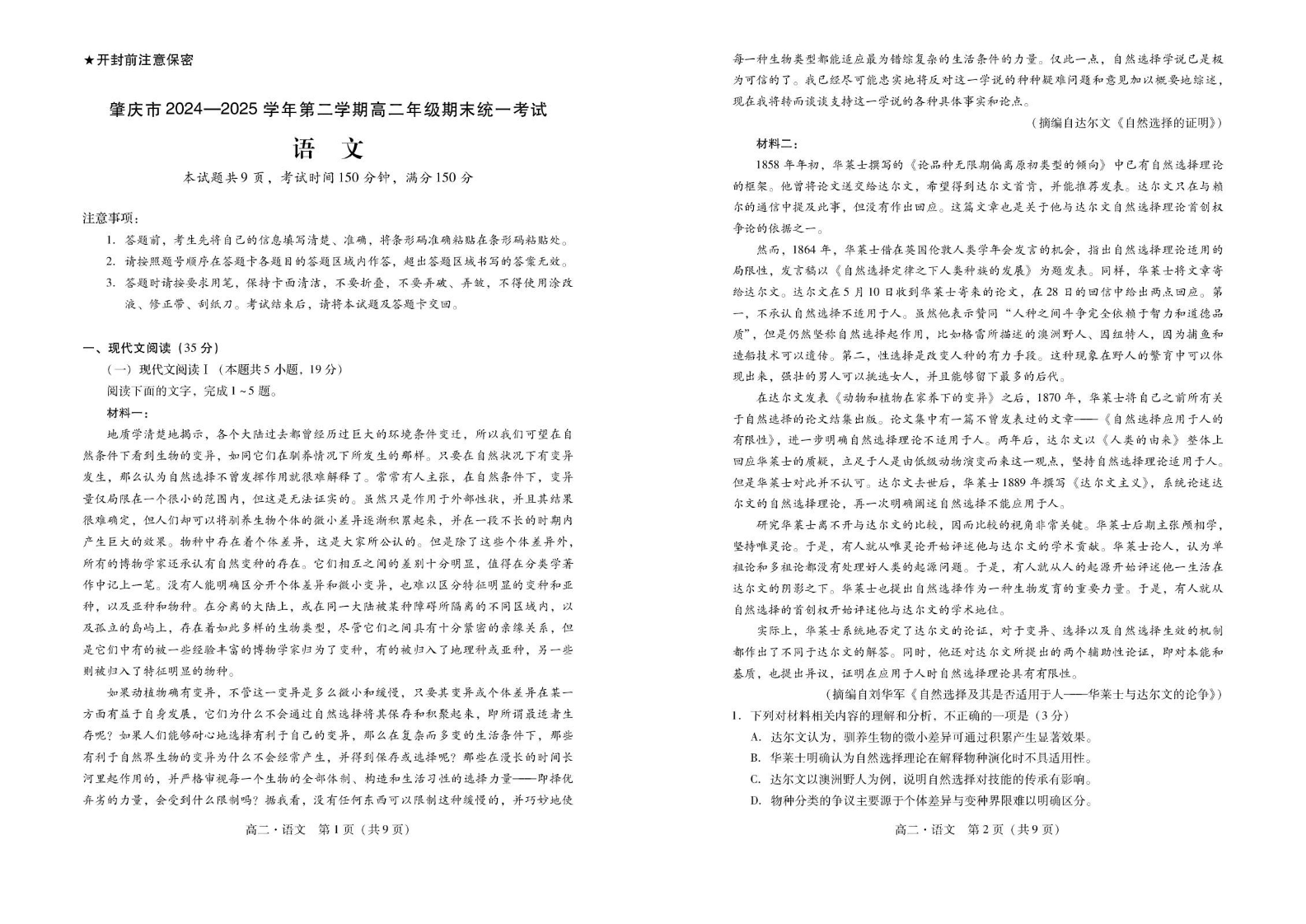 广东省肇庆市2024-2025学年高二下学期期末考试语文+答案