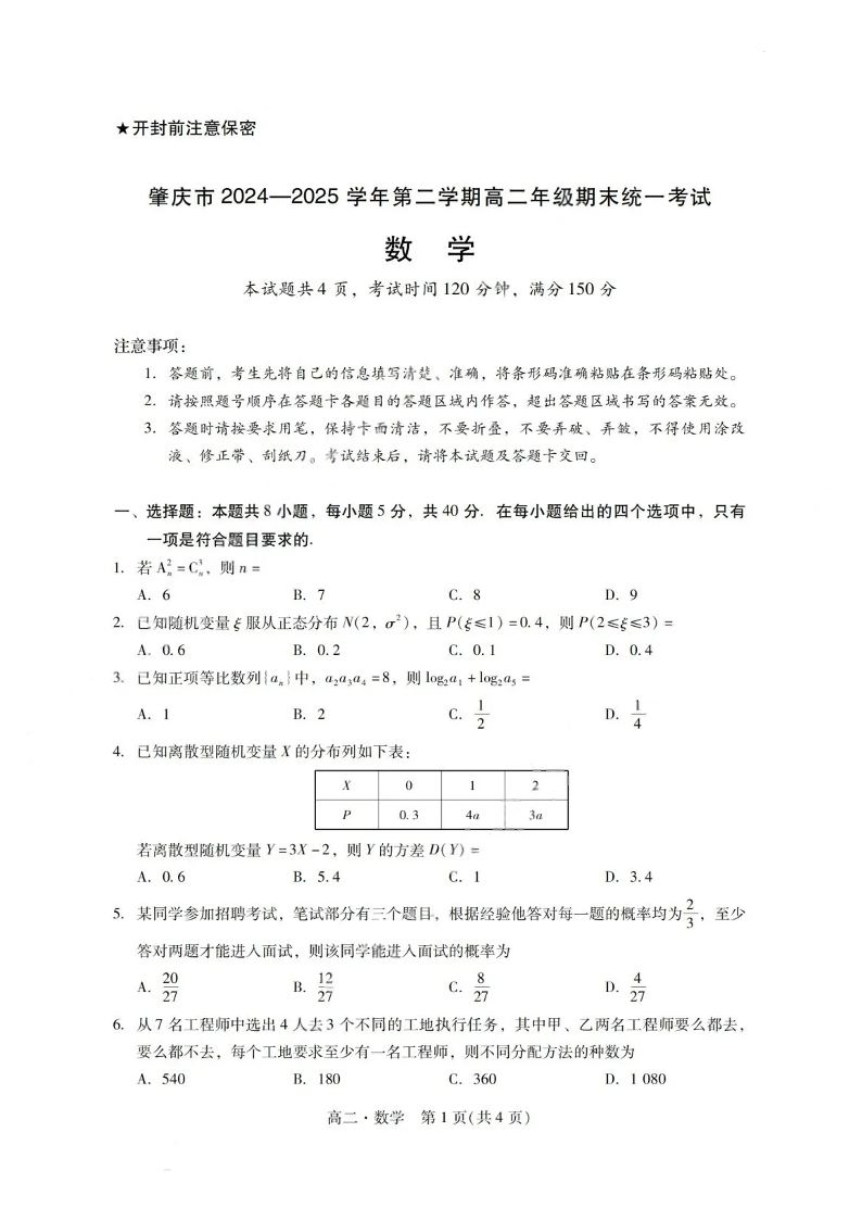广东省肇庆市2024-2025学年高二下学期期末考试数学