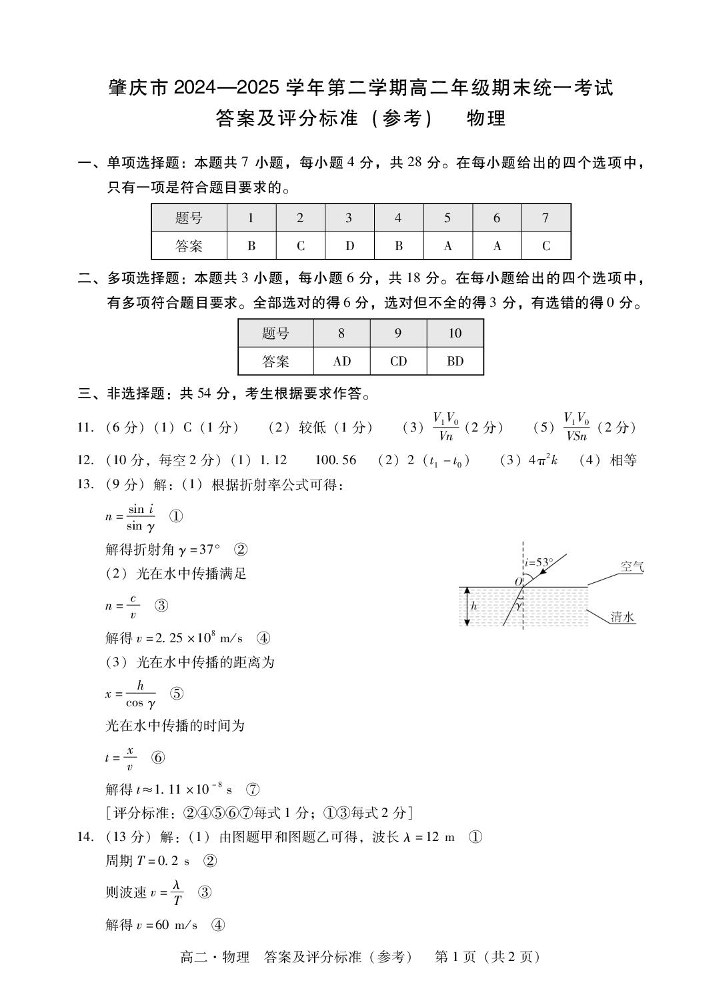 广东省肇庆市2024-2025学年高二下学期期末考试物理答案