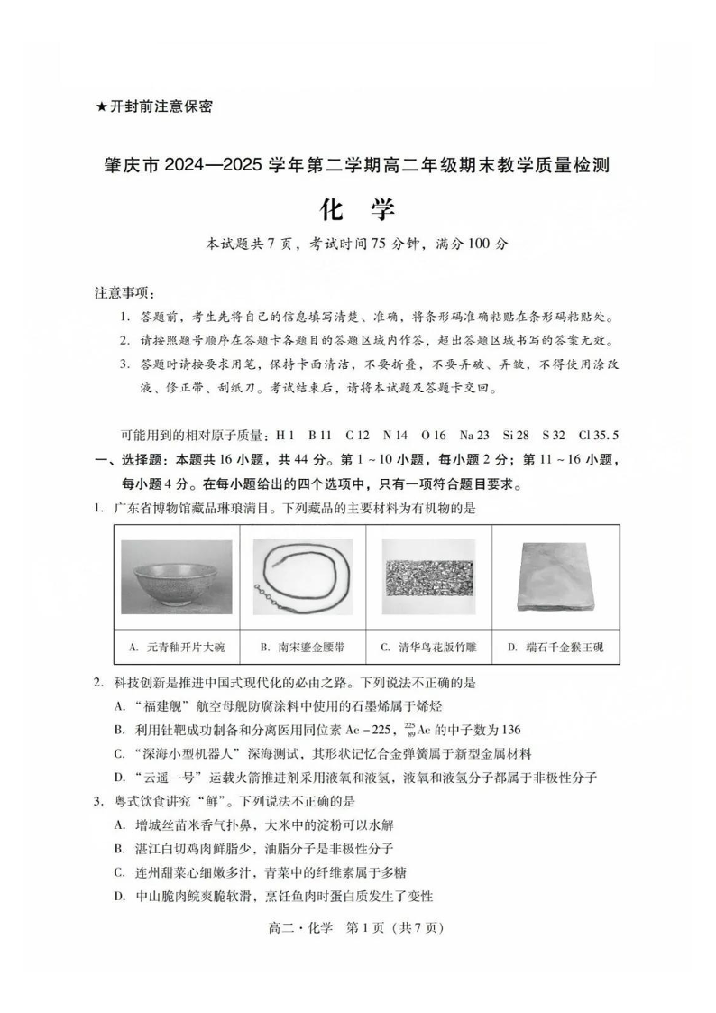 广东省肇庆市2024-2025学年高二下学期期末考试化学